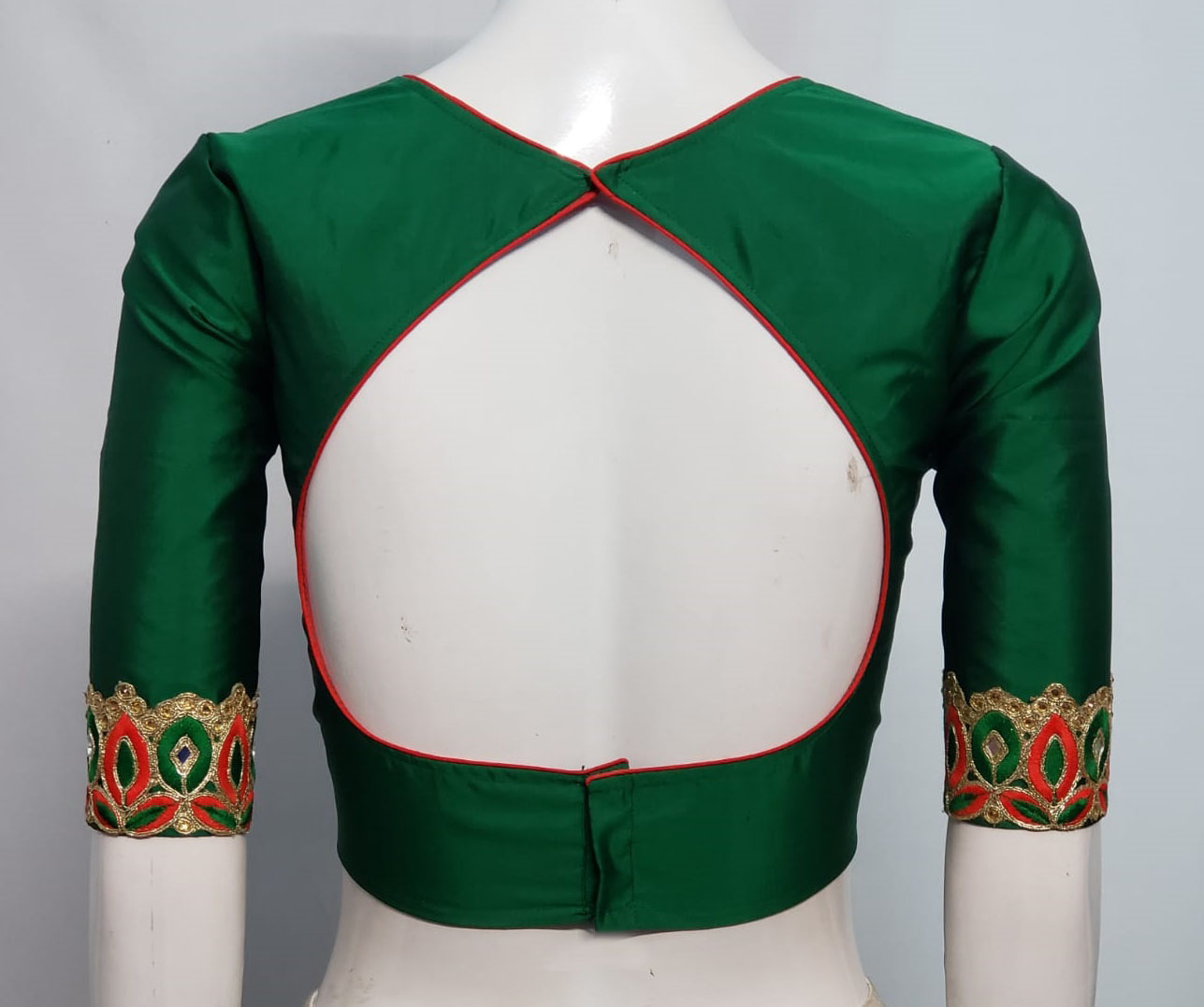 This is a Green & Red Color Samo Silk Embroidery Blouse. This Blouse is Sweet Heart Neckline in Frontside & Key-Hole Neckline in Backside. This is a Princess Cut, Padded, Glass Sleeve Blouse with Back open. You can team it up with any contrast colored Printed or Traditional Saree.