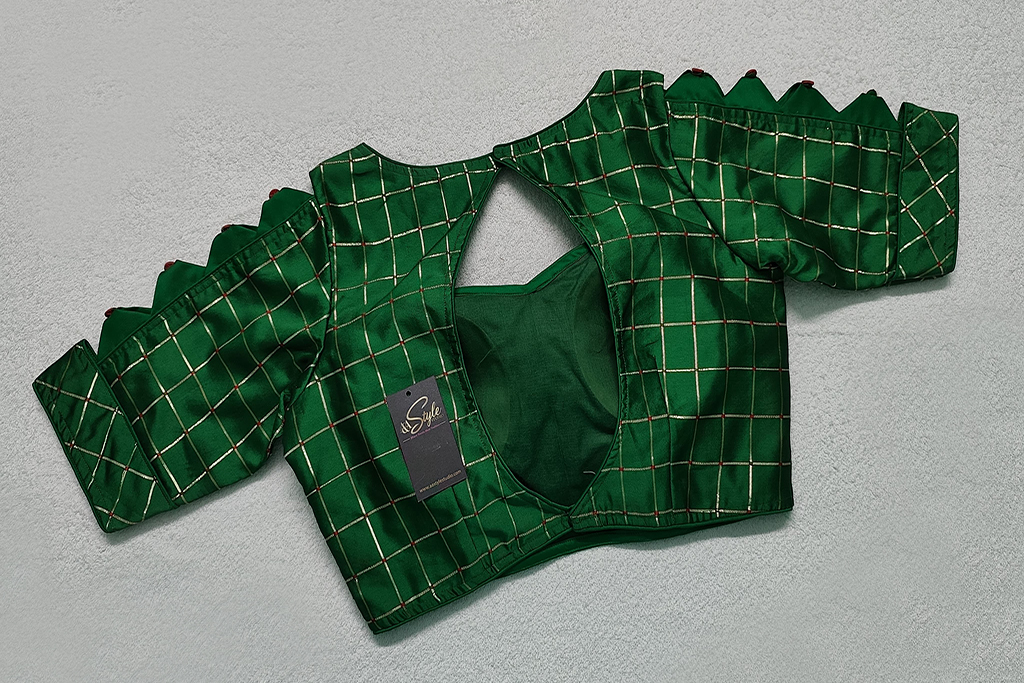 This is an Emerald Green Color Taffeta Silk Blouse. This Blouse is Leaf Neckline in Frontside & Keyhole Neckline in Backside. This is a Princess Cut, Padded, Glass Sleeve Blouse with Back Open. You can team it up with any contrast colored Printed or Traditional Saree.