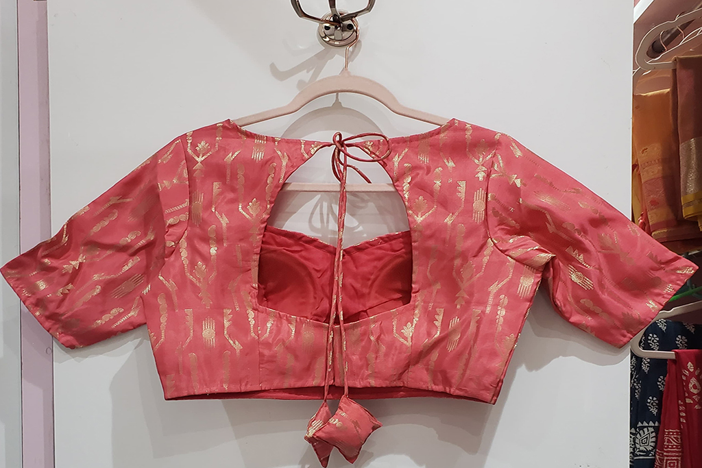 This is a Peach Color Brocade Blouse. This Blouse is Sweetheart Neckline in Frontside & Key-Hole Neckline in Backside with Tie-Up. This is a Princess Cut, Padded, Glass Sleeve Blouse with Back Open. You can team it up with any contrast colored Printed or Traditional Saree.