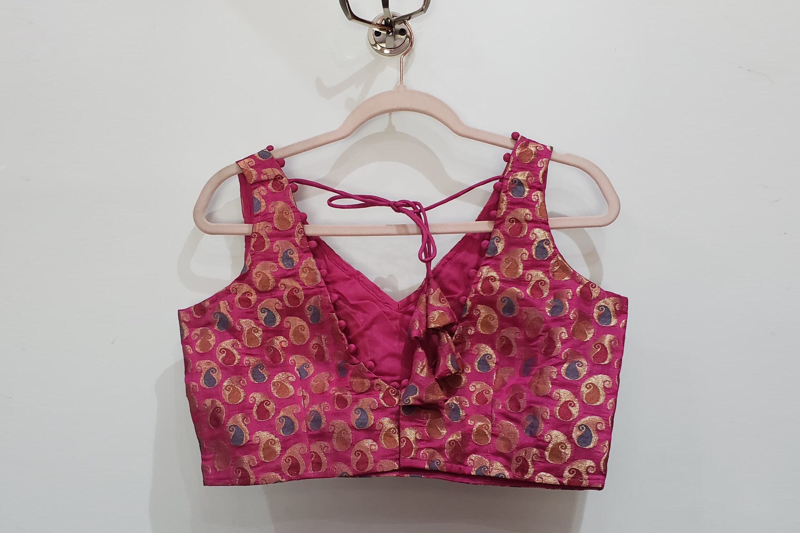This is a Pink Color Meena Kari Brocade Blouse. This Blouse is V-Neckline in both Frontside & Backside with Tie-Up. This is a Princess-Cut, Padded, Sleeveless Blouse with Back Open. You can team it up with any contrast colored Printed or Traditional Saree.