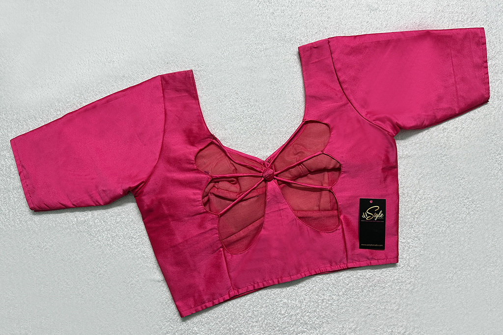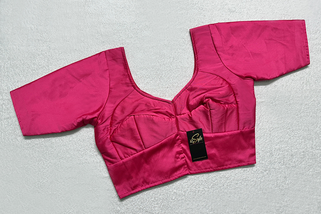 This is a Pink Color Samo Silk Blouse. This Blouse is Leaf Neckline in Frontside & Scallop Neckline in Backside with Criss-Cross Tie-Up. This is a Choli-Cut, Non-Padded (Used Sponge), Glass Sleeve Blouse with Front Open. You can team it up with any contrast colored Printed or Traditional Saree.