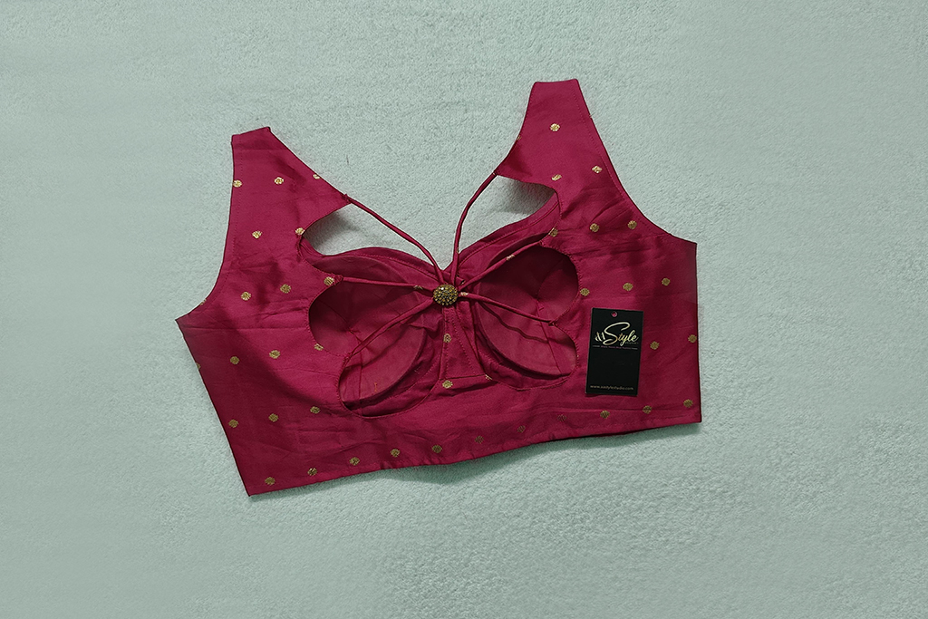 This is a Pink Color Taffeta Silk Blouse. This Blouse is Sweetheart Neckline in Frontside & Scallop Neckline in Backside with Tie-Up. This is a Princess Cut, Padded, Sleeveless Blouse with Front Open. You can team it up with any contrast colored Printed or Traditional Saree.