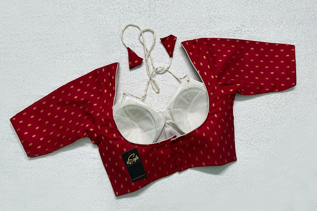 This is a Red & White Color Cotton Blouse. This Blouse is Sweetheart Neckline in Frontside & U-Neckline in Backside with Tie-Up. This is a Princess Cut, Padded, Glass Sleeve Blouse with Back Open. You can team it up with any contrast colored Printed or Traditional Saree.