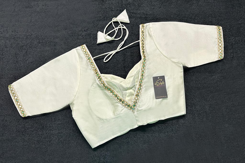 This is an Off-White Color Samo Silk Blouse. This Blouse is Sweetheart Neckline in Frontside & V-Neckline in Backside with Tie-Up. This is a Princess Cut, Padded, Glass Sleeve Blouse with Back Open. You can team it up with any contrast colored Printed or Traditional Saree.